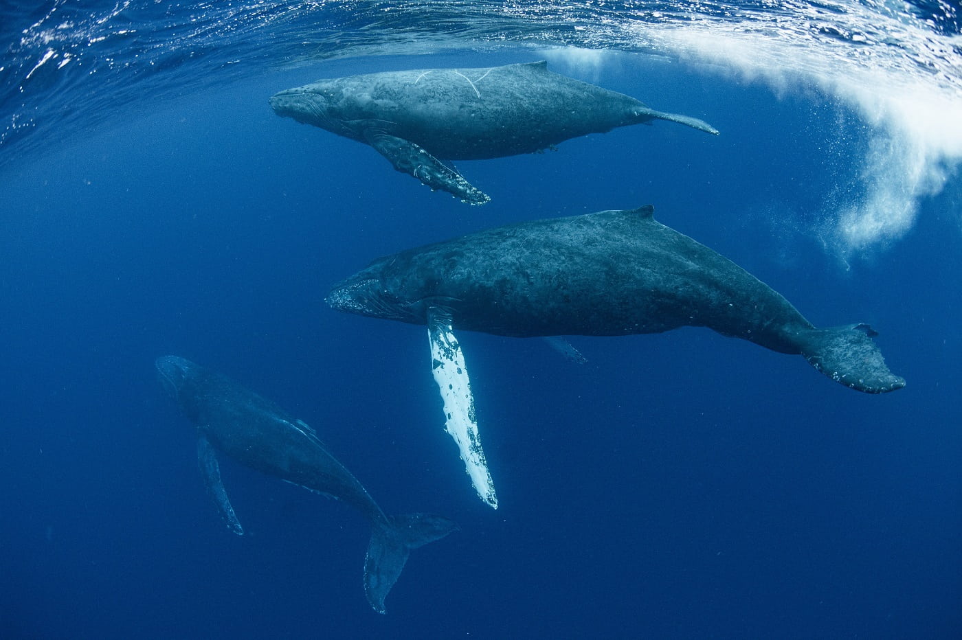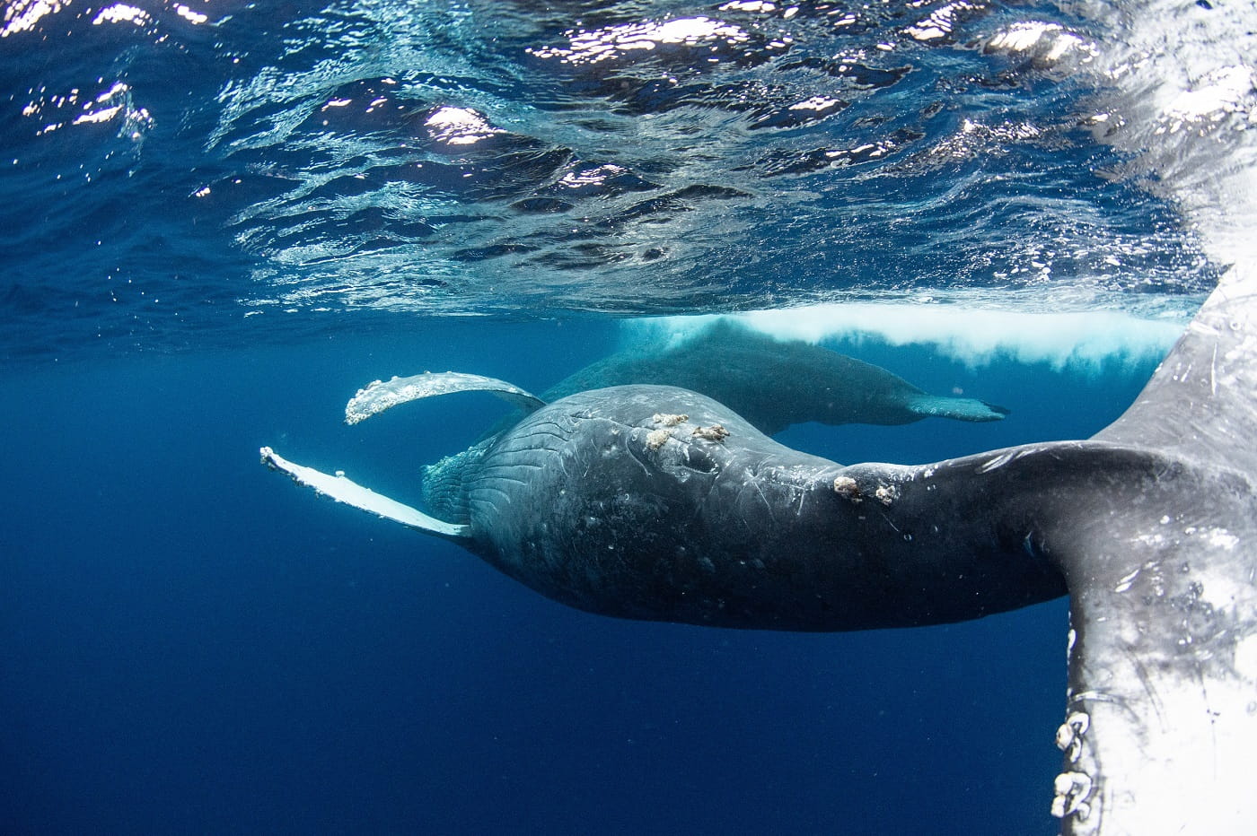 泳いだりバシャバシャと水面で音を立てたりすることは禁止されています。クジラはそういった不自然な水面の動きがあると警戒してすぐに逃げてしまいます。エントリー後は決して泳がずガイドの指示に従い浮いたまま水中の様子を見ます。また、クジラを追いかける、潜る、急接近するなどといった行為もNGです。